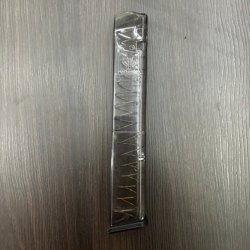 CARGADOR TRANSPARENTE EXPANSIVO PARA PISTOLAS GLOCK 17, 19, 19X, 26, 34 Y 45 DE 32 BALAS, CALIBRE 9MM -