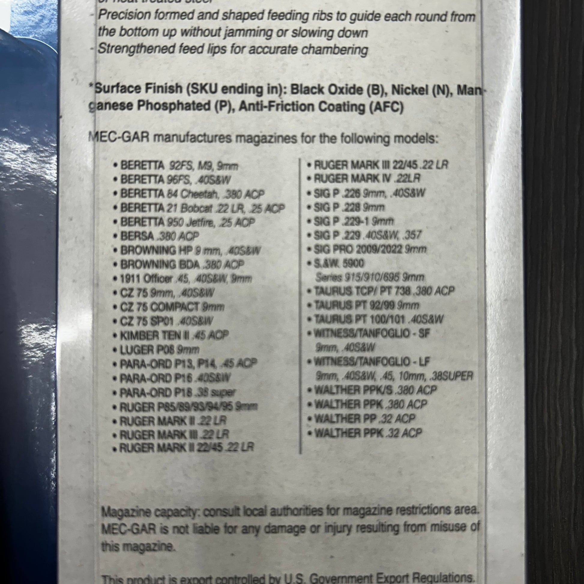 Este cargador de 15 balas ofrece fiabilidad y capacidad en cada recarga. Compatible con las pistolas Taurus PT92 y PT99, su construcción en acero tratado térmicamente y componentes de polímero de alta resistencia garantizan un funcionamiento fluido y duradero.